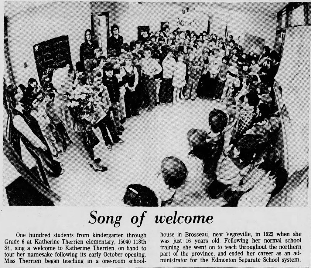 Katherine Therrien was born in Compton, Quebec on September 19, 1906. At a young age, Miss Therrien's family moved to Brosseau, Alberta. In 1922, at age 16, she became the single teacher of a one-room school. Her year's wage was only $900 and sometimes payment was made in garden produce. She was also responsible for carrying water in daily, lighting the fire to keep the school warm in winter as well as installing storm windows.